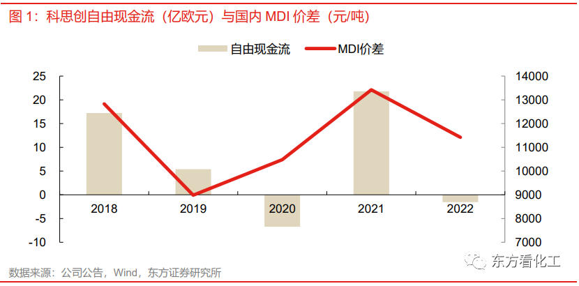 虽然科思创的聚氨酯收入体量仍大于万华化学,但会被ADNOC发出要约收购,是因为其市值已经下跌到较低水平。在ADNOC的要约发出之前,科思创的股价在40欧元每股左右,相比2018年的高点下跌了超过50%,市值也低于80亿欧元,这背后反映的正是科思创每况愈下的经营情况。2018年之后,除了2021年全球大宗品高景气阶段,其他时期科思创的财务指标都较差,这导致公司基本没有进行过有效扩张。到2022年由于自由经营现金流极低,甚至已经无法向股东分红,这对于海外公众公司来说是非常不利的情况。如果以其主要产品MDI的价差作为指标,可以看出科思创的盈利能力基本随着MDI价差的波动而起落。