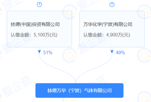 近日,林德万华(宁波)气体有限公司成立,法定代表人为付传,注册资本1亿元,经营范围包含:气体、液体分离及纯净设备销售;普通机械设备安装服务;特种设备出租等。股权穿透显示,该公司由万华化学全资子公司万华化学(宁波)有限公司、林德(中国)投资有限公司共同持股。