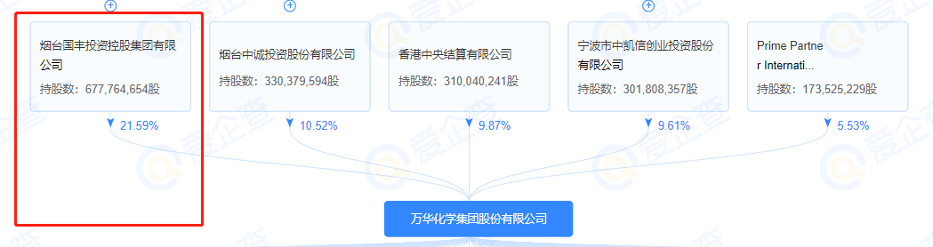 万华化学(宁波)成立于2006年2月27日,注册资本9.36亿元,法人代表为陈毅峰。目前,其由万华化学集团股份有限公司(以下简称“万华化学”)100%持股。而万华化学的大股东为烟台国丰投资控股集团有限公司,持股21.59%;烟台国丰投资控股集团有限公司大股东为烟台市人民政府国有资产监督管理委员会,持股90%。