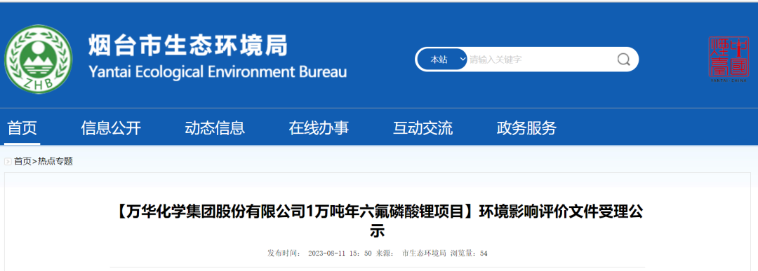近日,烟台市人民政府受理了万华化学集团股份有限公司1万吨/年六氟磷酸锂项目环境影响评价文件并予以公示。