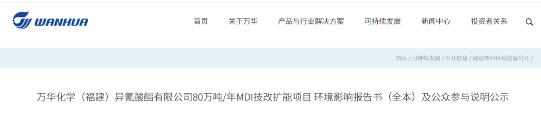 就在此前不久,万华化学发布万华化学(福建)异氰酸酯有限公司80万吨/年MDI技改扩能项目环境影响报告书(全本)及公众参与说明公示。