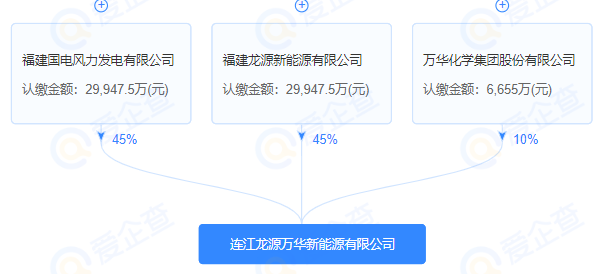 近日,连江龙源万华新能源有限公司成立,法定代表人为唐永卫,注册资本超6亿元,经营范围包含:风力发电技术服务;新兴能源技术研发等。股权穿透显示,该公司由龙源电力全资子公司福建龙源新能源有限公司、万华化学等共同持股。