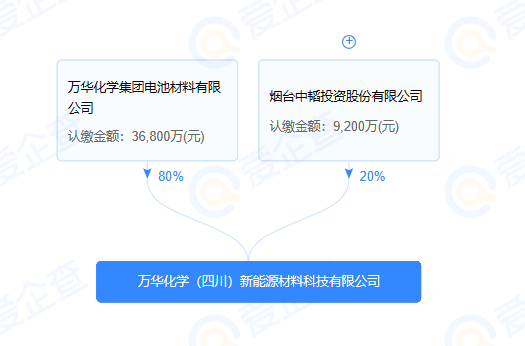 2023年6月,万华化学(四川)新能源材料科技有限公司成立,注册资本4.6亿元,经营范围包含:电子专用材料制造;电子专用材料研发;高纯元素及化合物销售等。该公司由万华化学全资子公司万华化学集团电池科技有限公司、烟台中韬投资股份有限公司共同持股。