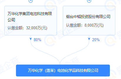 此前2023年7月,万华化学(蓬莱)电池化学品科技有限公司成立,法定代表人为王晓星,注册资本4亿元人民币,经营范围包含:电子专用材料研发;电子专用材料制造;高纯元素及化合物销售等。股权穿透显示,该公司由万华化学全资子公司万华化学集团电池科技有限公司、烟台中韬投资股份有限公司共同持股,其中万华化学集团电池科技有限公司持股80%。