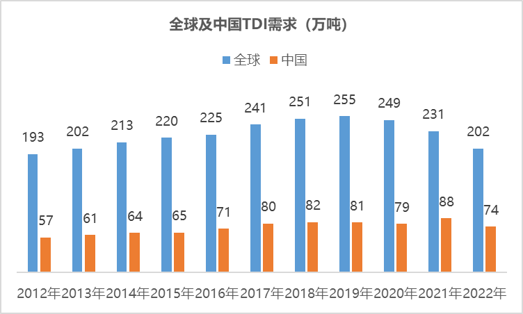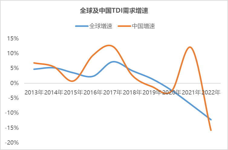 在俄乌冲突、欧洲能源危机、全球疫情反复,欧美地区高通胀、美联储强势加息等多重因素的影响下,2022年全球经济增速急剧回落至3.4%,中国GDP增速下滑至3%。TDI主要下游应用如床垫、沙发、座椅等受此影响,全球TDI需求量出现明显下滑,2022年全球TDI需求减少至202万吨,同比下降12%,2022年中国TDI需求量减少至74万吨,同比下降16%。