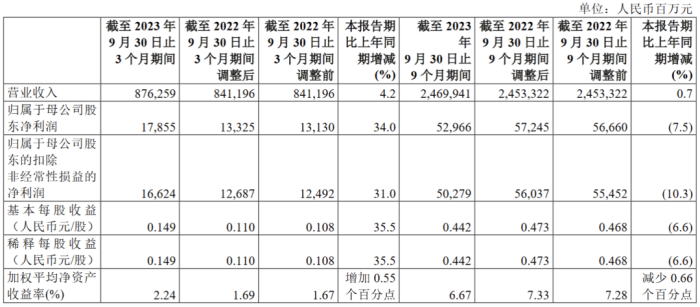 2023年10月26日,中国石化披露三季度报告,前三季度公司实现营收2.47万亿元,同比增长0.7%;实现归母净利润529.66亿元,同比下降7.5%。其中,第三季度净利润178.55亿元,同比增长34%。报告期内石油石化市场回暖,炼化产品毛利回升、成品油经营量增加,公司整体毛利水平同比增加。