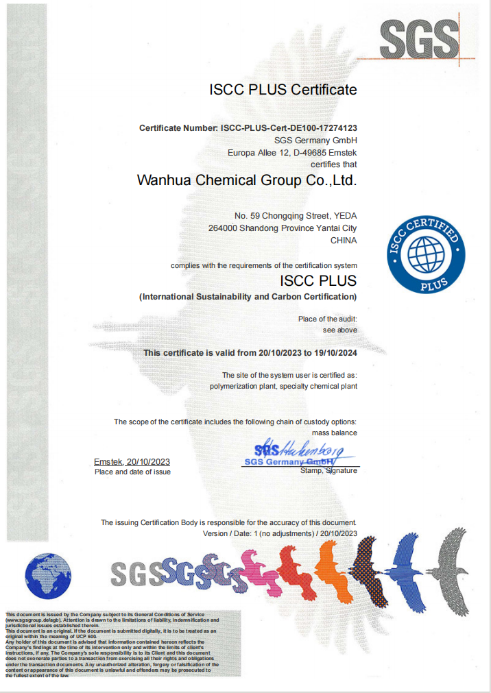 这一认证说明产品具备可持续生产流程,确保产品生命周期的最小环境影响,是我们为环境和社会做出贡献的一项重要贡献。万华化学将继续加大在可持续生产的投入,使用可持续原材料来生产并供应低碳足迹产品,推动提升行业价值链的可持续发展。