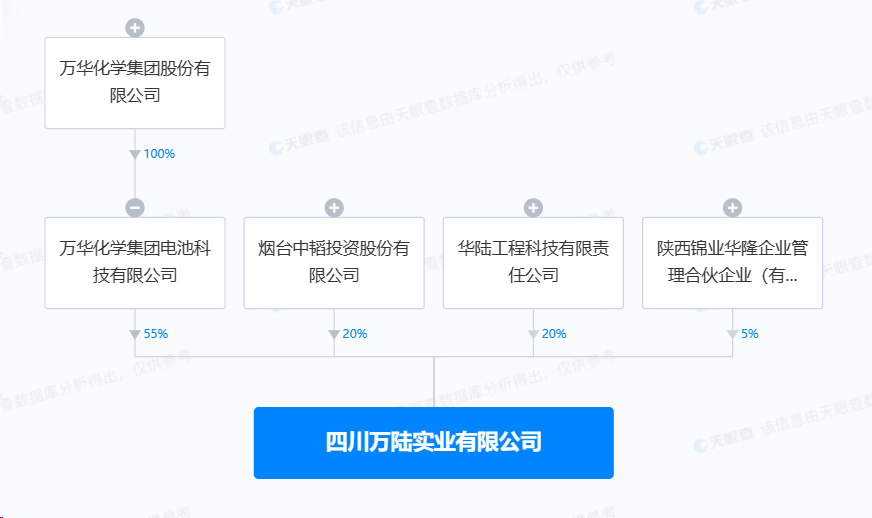 四川万陆实业有限公司成立于2021年12月,是万华化学的控股孙公司,由万华化学集团电池科技有限公司控股55%,业务经营范围包括一般项目:基础化学原料制造(不含危险化学品等许可类化学品的制造),合成材料制造(不含危险化学品),化工产品销售(不含许可类化工产品)等。