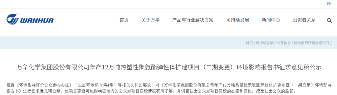近日,万华化学集团股份有限公司年产12万吨热塑性聚氨酯弹性体扩建项目(二期变更)环境影响报告书征求意见稿公示。