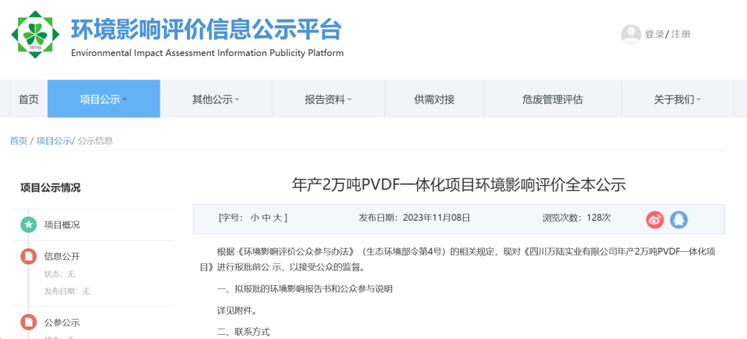 近日,四川万陆实业有限公司年产2万吨PVDF一体化项目环境影响报告书报批前公示。