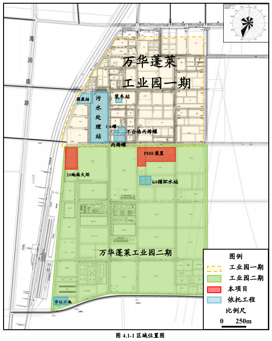 项目名称:万华化学(蓬莱)有限公司90万吨/年丙烷脱氢项目;建设性质:新建;建设单位:万华化学(蓬莱)有限公司;建设地点及占地面积:山东省烟台市黄渤海新区蓬莱化工产业园,总占地面积87000m2;总投资及环保投资:项目总投资256344万元,环保投资5411.85万元;劳动定员:90人,按四班三运转;年运行时间:8000小时;操作弹性:60%~110%;项目实施规划:2024年11月开工,2026年10月建成运行;建设内容及规模:新建一套90万吨/年丙烷脱氢装置及配套配套辅助工程、环保工程等;主要公用工程和部分环保工程依托现有(在建)。项目产品方案:本项目主要产品为丙烯,全部作为产品外售。主要副产品为氢气、C4和C6重烃,副产品全部作为产品外售。