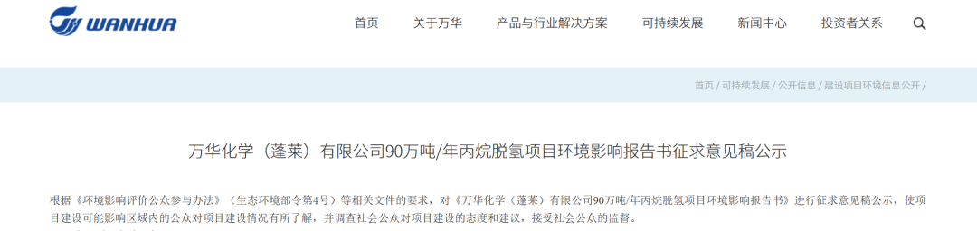 2023年12月22日,万华化学官网发布公告,对万华化学(蓬莱)有限公司90万吨/年丙烷脱氢项目环境影响报告书征求意见稿公示。