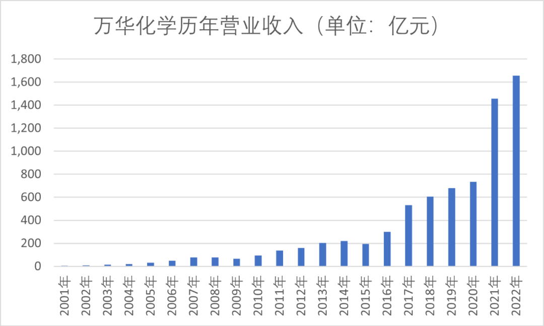拉长周期来看,万华化学2022年实现营业收入1655.65亿元,比上市前一年(2000年)增长了478.90倍,其中,2011至2022年营收规模和归母净利润规模分别从137亿元增长至1656亿元,从19亿元增长至162亿元,年均复合增速达均超20%。