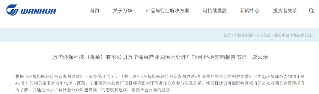 1月11日,万华化学控股孙公司万华环保科技(蓬莱)有限公司万华蓬莱产业园污水处理厂项目环境影响报告书第一次公示。