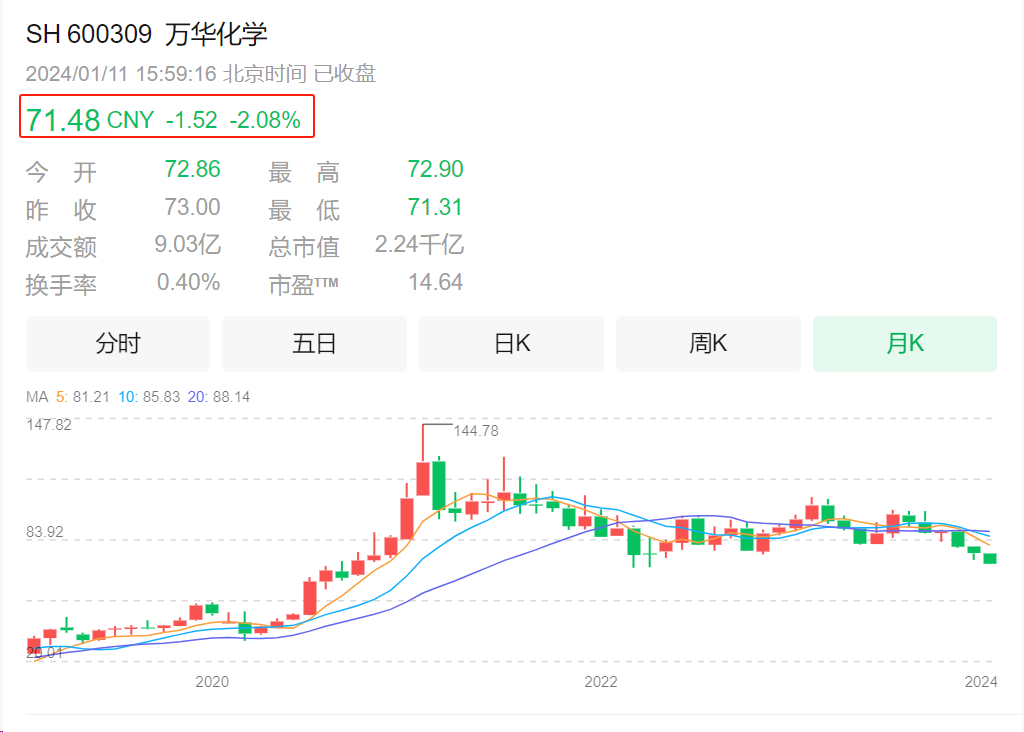 1月11日,万华化学以71.48元的价格收盘,如果从2021年的高点算起,万华化学股价已经“腰斩”,如果从2023年106.40元的阶段性高点算起,万华股价也已经跌超30%。