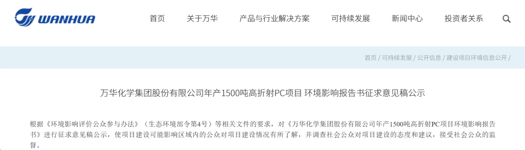 1月9日,万华化学集团股份有限公司年产1500吨高折射PC项目环境影响报告书征求意见稿公示。