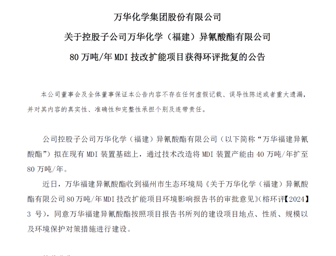 (1)万华福建:80万吨/年MDI装置技改扩能