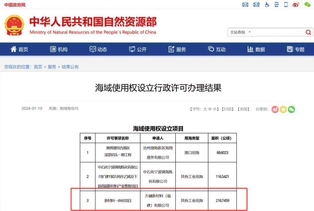 1月10日,万融新材料(福建)有限公司(下称:万融新材料(福建))福清万融新材料一体化项目海域使用权获批。该一体化项目拟于福清市江阴半岛建设丙烷脱氢(PDH)一体化及配套设施,项目主攻高端聚烯烃产品。