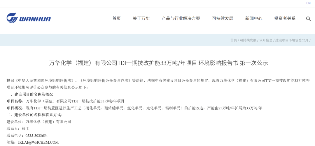 (2)万华福建:33万吨/年TDI一期技改扩能