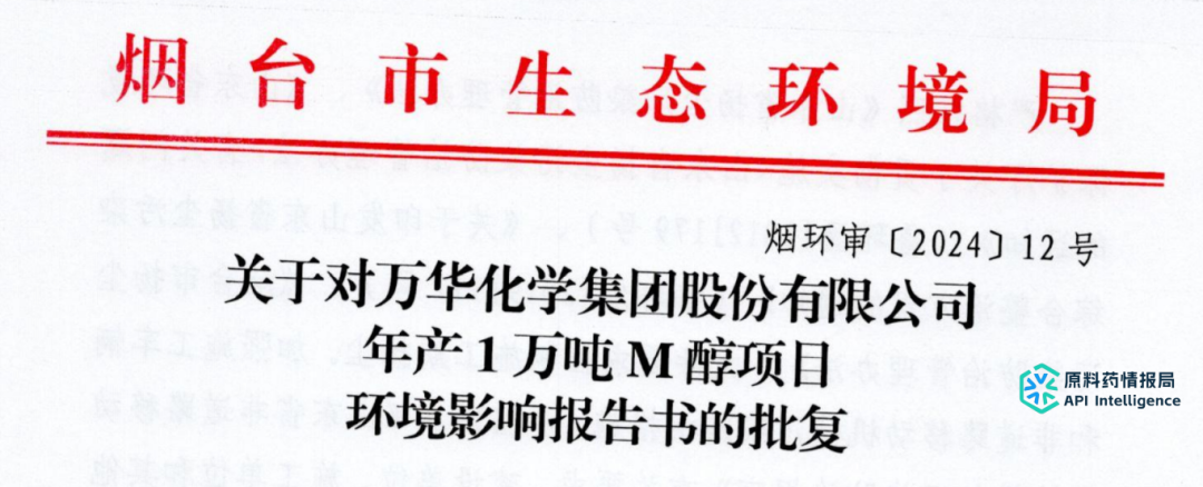 【原料药情报局】获悉:近日,关于万华化学集团股份有限公司年产1万吨M醇项目在相关网站批复公示。