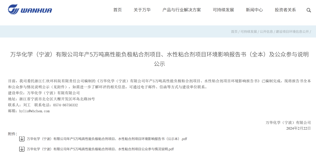2月22日,万华化学发布年产5万吨高性能负极粘合剂项目、水性粘合剂项目环境影响报告书,拟投资2.77亿元在宁波大榭万华新材料园区内建设年产5万吨电池负极粘合剂;投资0.35亿元在大榭万华工业园内建设年产0.5吨水性粘合剂。