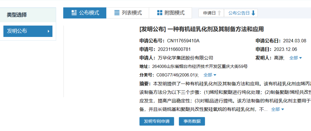 据国家知识产权局公告,万华化学集团股份有限公司申请一项名为“一种有机硅乳化剂及其制备方法和应用”,公开号CN117659410A,申请日期为2023年12月。