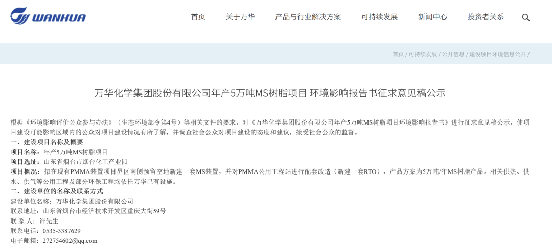 3月29日,万华化学山东烟台化工产业园年产5万吨MS树脂项目环评公示,建设内容主要为5万吨/年MS 树脂颗粒装置。
