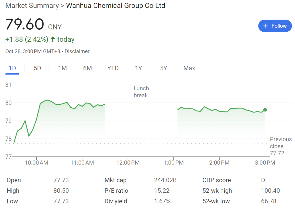 今日,万华化学收涨2.42%,报79.60元人民币/股,市值2440.2亿元人民币。