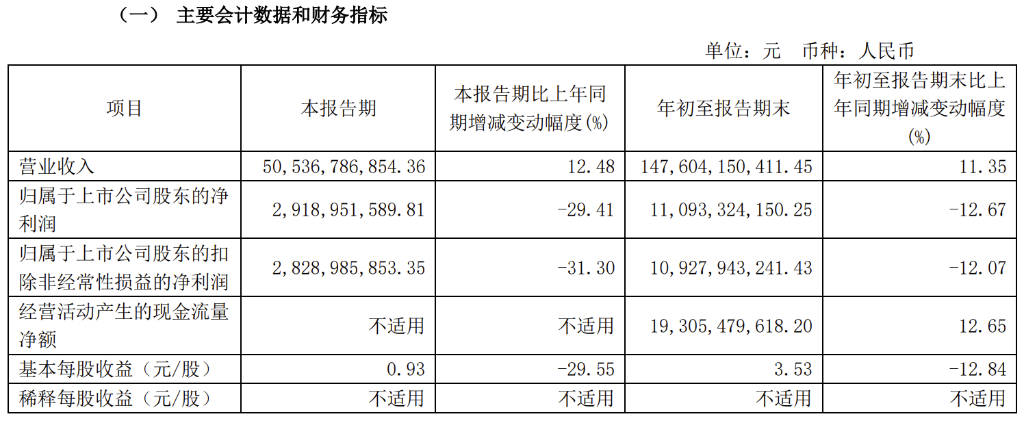 1)主要财务数据:第三季度总营收:505.37亿元人民币,同比增长12.48%;前三季度总营收1476.04亿元人民币,同比增长11.35%。第三季度净利润:29.19亿元人民币,同比下降29.41%;前三季度营收110.93亿元人民币,同比下降12.67%。第三季度每股收益:0.93元人民币,同比下降29.55%;前三季度营收3.53元人民币,同比下降12.54%。第三季度扣除非经常性损益的净利润:28.29亿元人民币,同比下降31.30%。