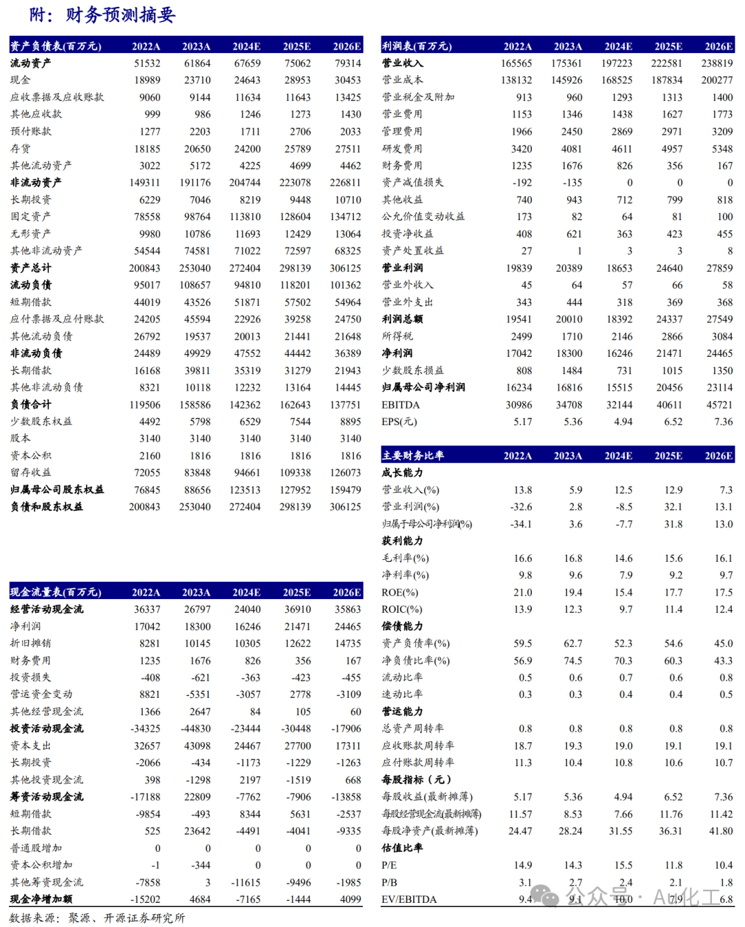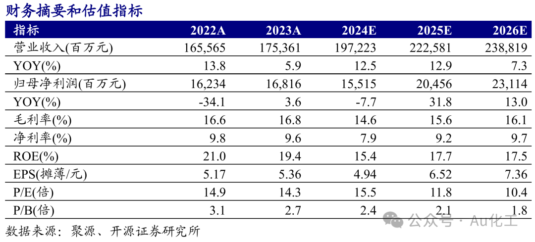 2024Q1-Q3,公司实现营收1,476.04亿元,同比增长11.35%,实现归母净利润110.93亿元,同比下降12.67%。其中,2024Q3单季度,公司实现营收505.37亿元,同比增长12.48%,环比下降0.73%;实现归母净利润29.19亿元,同比下降29.41%,环比下降27.33%。考虑未来公司产品价格下滑以及原材料涨价风险,我们下调2024-2026年盈利预测:预计公司2024-2026年归母净利润分别为155.15(-24.97)、204.56(-13.69)、231.14(-12.85)亿元,对应EPS分别为4.94(-0.80)、6.52(-0.43)、7.36(-0.41)元/股,当前股价对应PE分别为15.5、11.8、10.4倍。我们认为,公司作为化工行业龙头企业,有望率先受益于化工板块景气修复行情,未来新项目投产将带动公司业绩增长,维持“买入”评级。