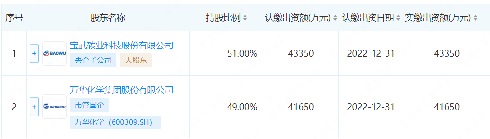 资料显示,浙江宝万碳纤维有限公司,是一家碳纤维原丝生产企业,由宝武碳业与万华化学共同出资组建。注册资本为8.5亿元人民币,法定代表人是李峻海,宝武碳业和万华化学分别持股51%和49%。