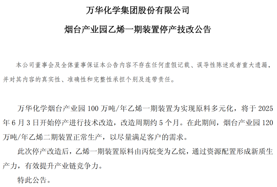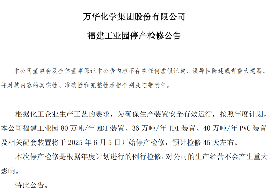 万华化学,四大装置停产检修!涉及MDI、TDI、PVC、乙烯…
