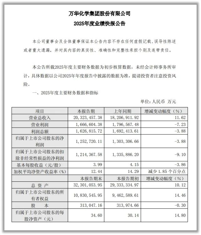 3月16日晚间,大白马股万华化学(600309.SH)发布了2025年度业绩快报。次日,股价便下跌了6%。根据公告显示,营收首次突破了2000亿元,同比增长11.62%;归属于上市公司股东的净利润为125.27亿元,同比下降3.88%。这份成绩单确实有些出人意料,这已是万华化学连续第二年净利润下滑,难怪市场用脚投票。在投者看来,万华化学像是陷入了增收不增利的困局。