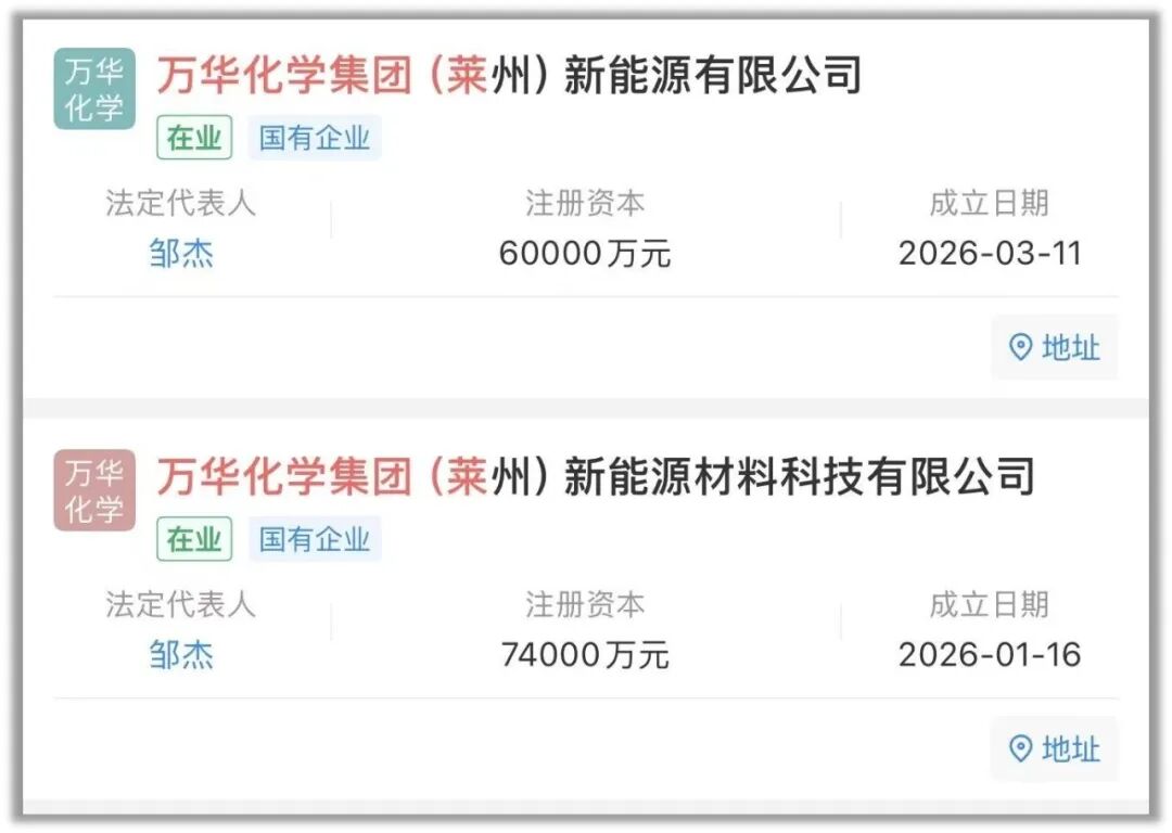 近期,根据数据显示,万华化学2026年在莱州新注册了两家子公司,此次新公司的成立,是万华化学在莱州新能源布局的最新一步,电池材料是万华化学明确定位的“第二增长曲线”。