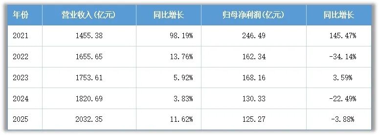 不过,2025年第四季度的数据值得注意。根据业绩快报测算,四季度公司实现营收590.09亿元,归母净利润33.70亿元,同比分别增长71.21%和73.71%。