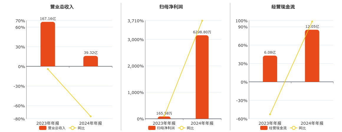 公司营业总收入为39.32亿元。归母净利润为6298.80万元,较去年同报告期归母净利润增加6133.22万元,实现2年连续上涨,同比较去年同期上涨3704.04%。经营活动现金净流入为12.05亿元,较去年同报告期经营活动现金净流入增加5.98亿元,同比较去年同期上涨98.37%。