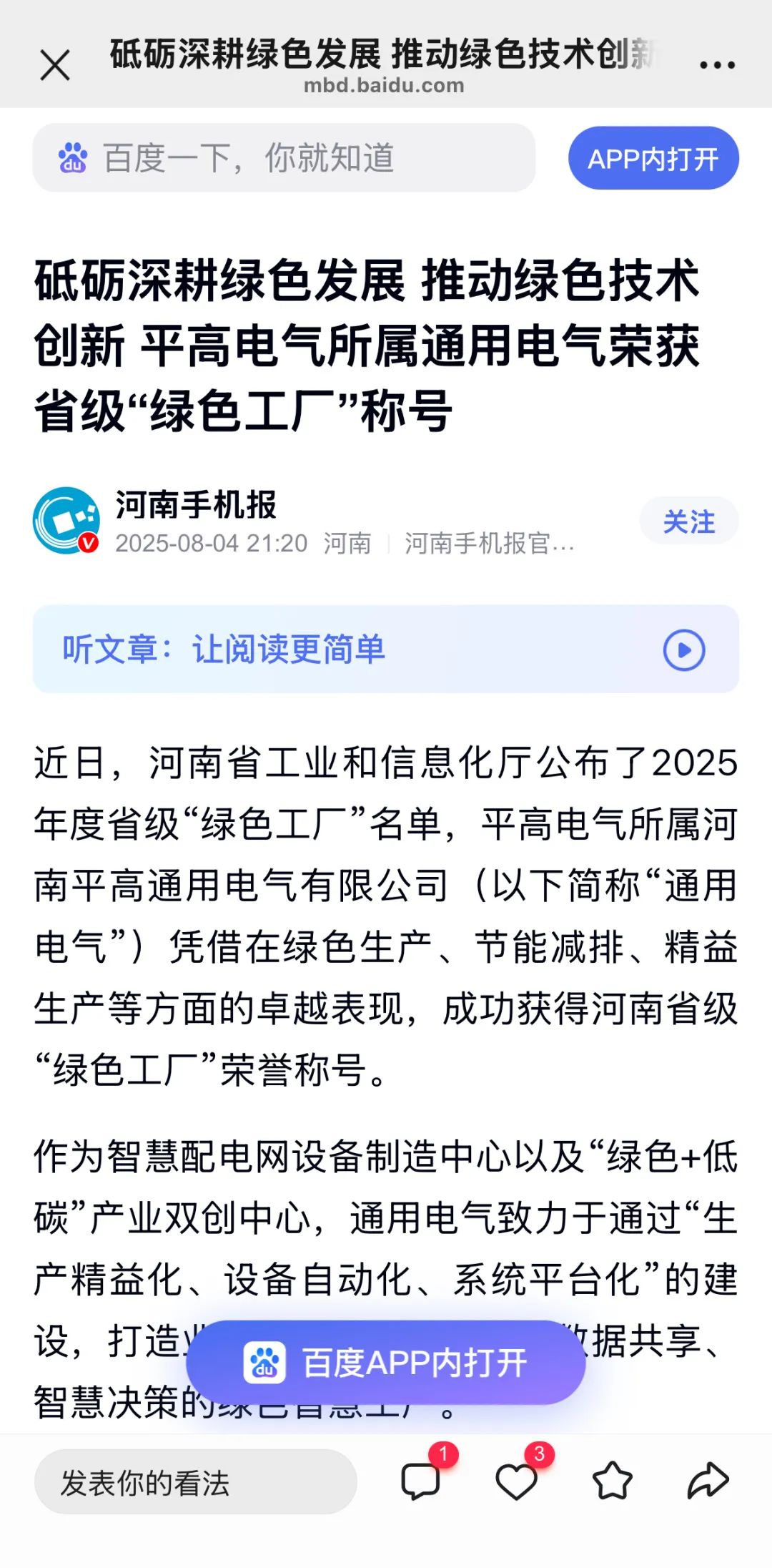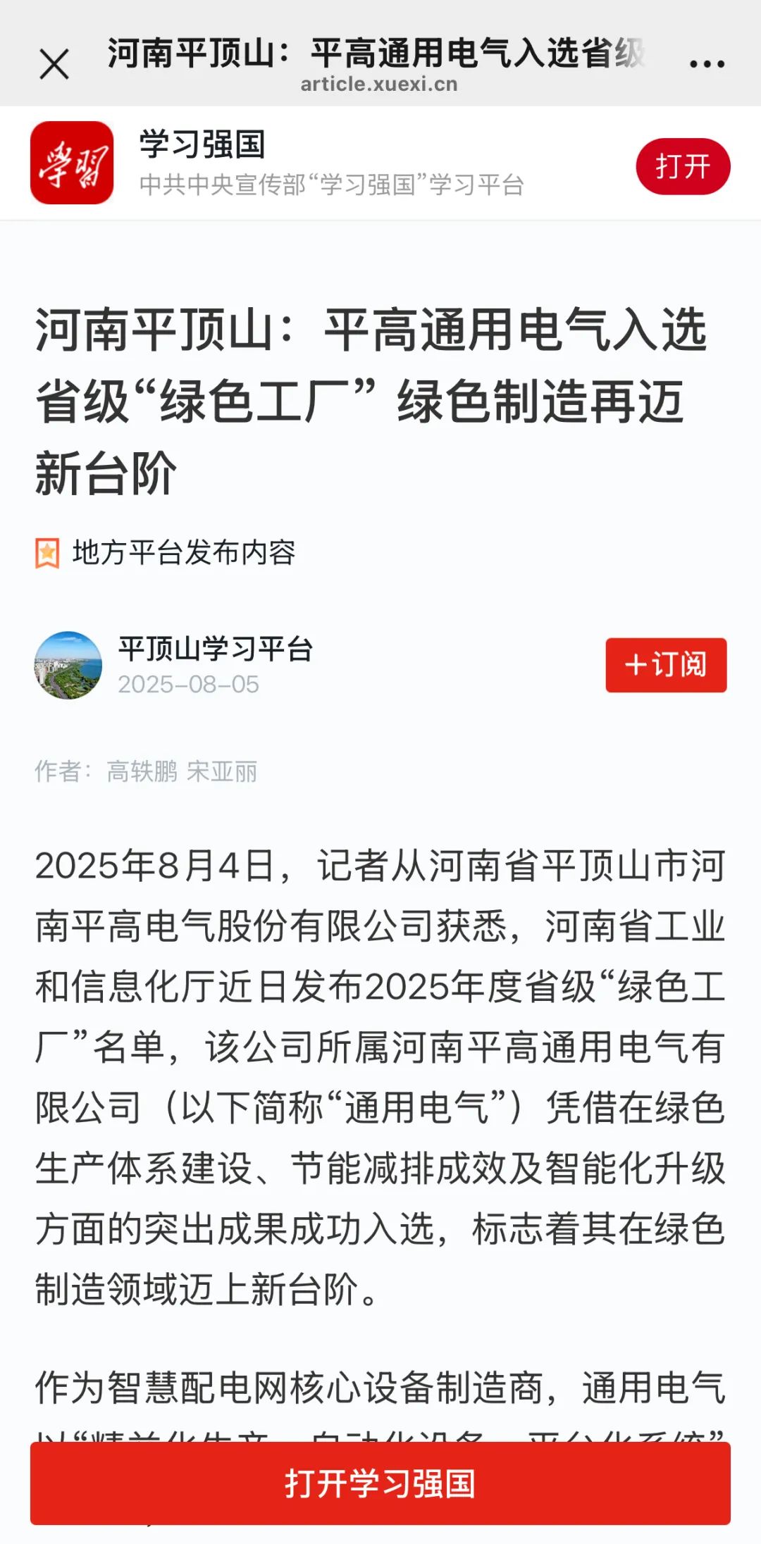 近日,河南省工业和信息化厅公布了2025年度省级“绿色工厂”名单,平高电气所属河南平高通用电气有限公司(以下简称“通用电气”或“公司”)凭借在绿色生产、节能减排、精益生产等方面的卓越表现,成功获得河南省级“绿色工厂”荣誉称号。