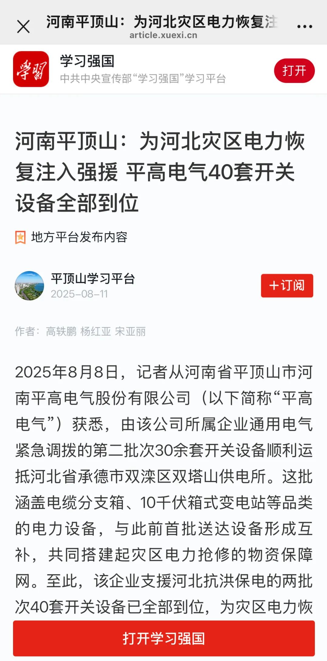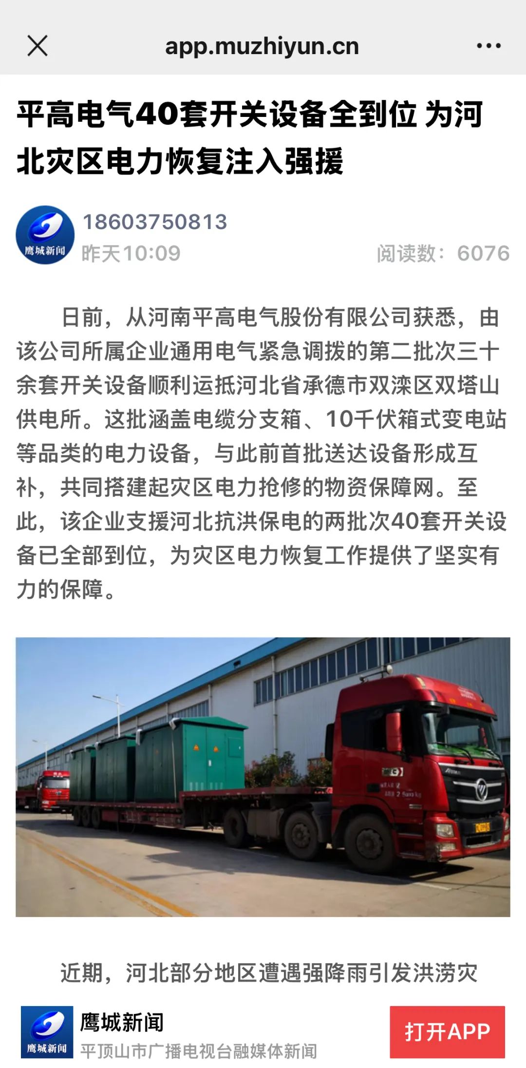 2025年8月8日,记者从河南省平顶山市河南平高电气股份有限公司(以下简称“平高电气”或“公司”)获悉,由该公司所属企业通用电气紧急调拨的第二批次30余套开关设备顺利运抵河北省承德市双滦区双塔山供电所。这批涵盖电缆分支箱、10千伏箱式变电站等品类的电力设备,与此前首批送达设备形成互补,共同搭建起灾区电力抢修的物资保障网。至此,该企业支援河北抗洪保电的两批次40套开关设备已全部到位,为灾区电力恢复工作提供了坚实有力的保障。
