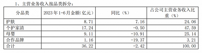 分品类看,今年上半年,上海家化护肤品类营收8.71亿元,同比增长7.16%,占公司主营业务收入的比重为24.06%。