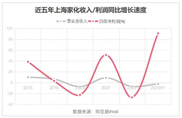 收入端来看,近几年上海家化营业收入增速起伏不定、并且多次出现负增长的尴尬局面。