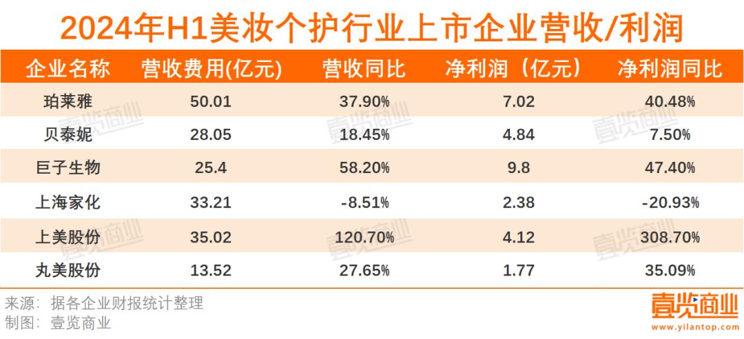从各企业半年报可以看到,美妆行业的卷没有影响头部玩家的发挥。除了上海家化以外,已上市的美妆个护企业,几乎都在今年上半年保持了营收、净利润同比正增长。其中,上美集团实现了营收、净利润同比三位数增长,珀莱雅、巨子生物、丸美股份都实现了营收、净利润同比二位数的增长。