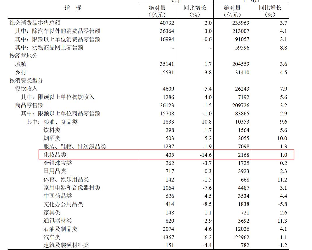 国家统计局数据还显示,2024年前6个月1%的销售额同比增幅,仅高于2020年、2022年这两个特殊年份,6月单月化妆品类零售总额为405亿元,同比下降14.6%,总额跌幅滑入近10年同期最低谷。