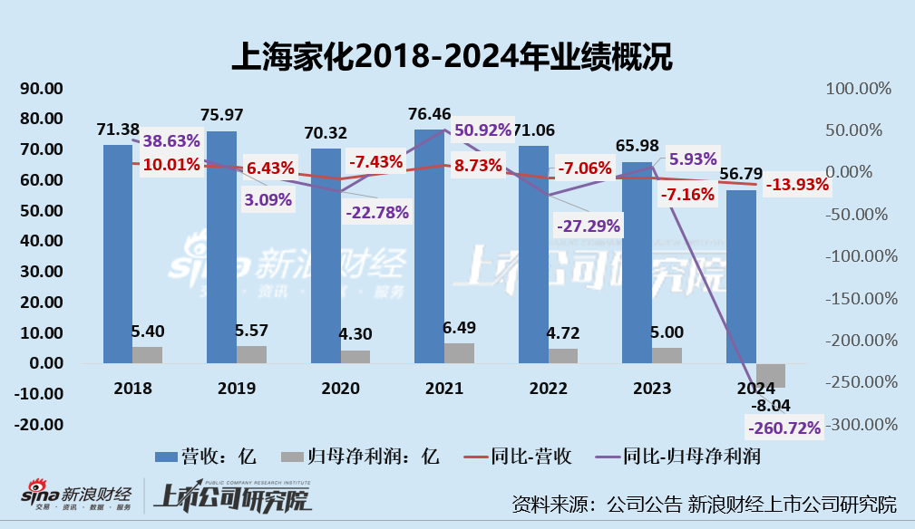 其中,2024年上海家化营收同比下降13.93%,归母净利润同比下降260.72%,由盈转亏,这也是上海家化自上市以后首次出现亏损。这也是林小海自2024年6月上任后提交的首份全年成绩单。