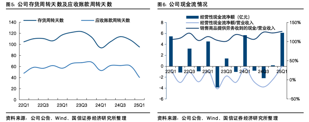 营运能力方面,公司2024年存货周转天数为108天,同比减少5天;应收账款周转天数为62天,同比减少7天。2025Q1存货周转天数为95天,同比增加1天;应收账款周转天数为40天,同比减少13天。现金流方面,公司2024年经营性现金流净额为2.73亿元/yoy+164.86%,主要系上年同期支付高额股权激励行权现金与本期战略举措调整影响;2025Q1经营性现金流净额为6.16亿元/yoy+7.96%;经营质量进一步改善,营运健康度提升。
