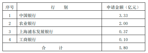 其中,向中国各银行申请综合授信额度为3.33亿元;向农业银行申请综合授信额度为2亿元;向上海浦东发展银行申请综合授信额度为0.37亿元;向工商银行申请综合授信额度为0.1亿元。