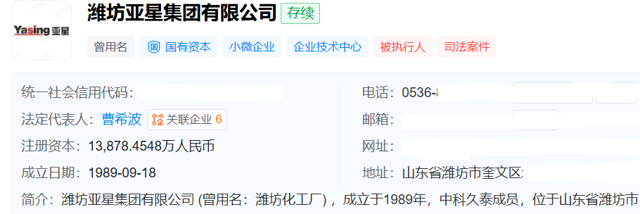天眼查 显示,亚星集团成立于1989年9月,注册资本约为1.39亿元,法定代表人是曹希波。