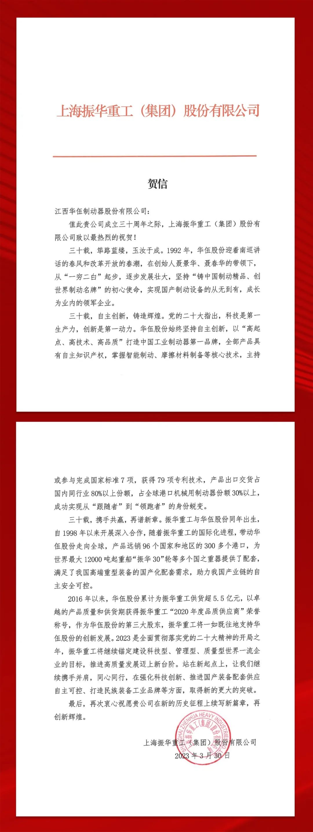 值此华伍股份成立三十周年之际,公司收到上海振华重工(集团)股份有限公司发来的贺信。