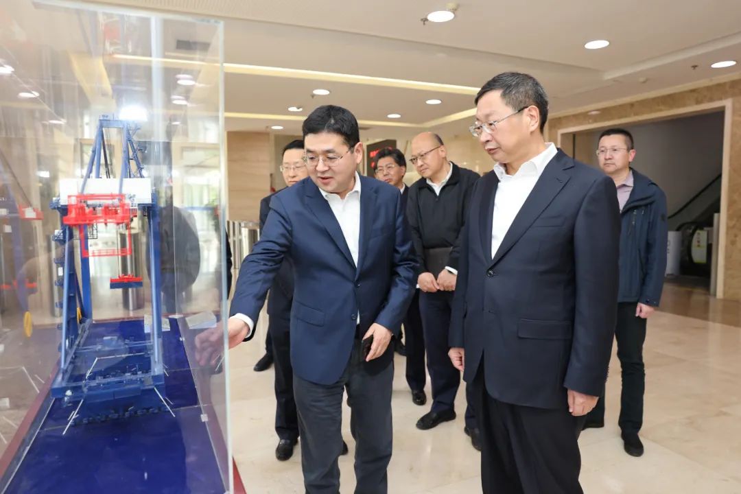 朱芝松在企业大厅察看了自动化码头装卸系统、海上升压站、天鲲号挖泥船等产品模型,详细了解振华重工30多年来发展情况。在和企业负责人座谈交流时,朱芝松对振华重工踔厉奋发、砥砺前行,持续打造高端制造上海品牌、不断走向全球开拓国际市场所取得的成绩表示祝贺。
