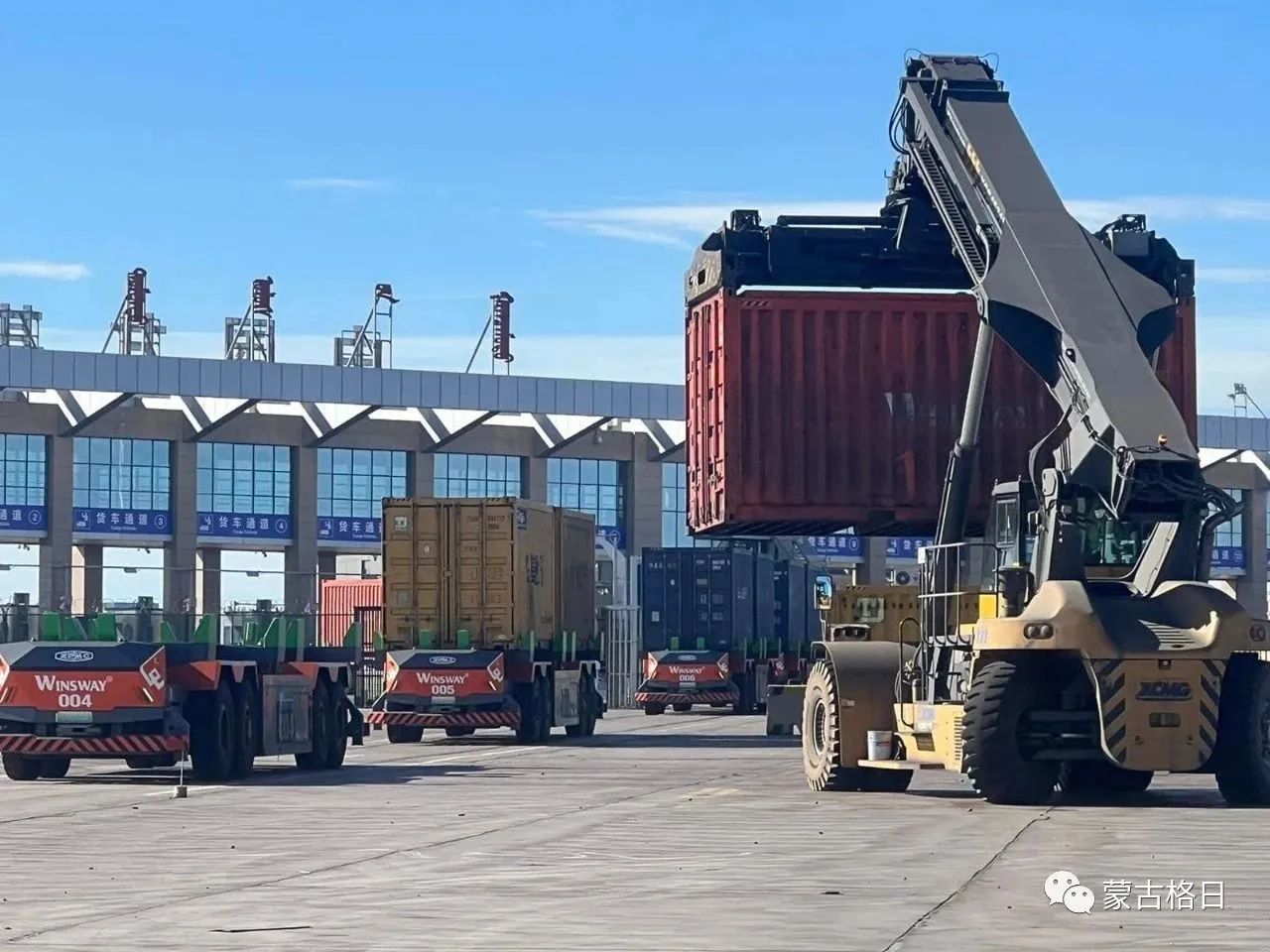 甘其毛都-嘎顺苏海图口岸是中蒙两国煤炭运输量最大的贸易口岸,为在满足中蒙两国法律法规的基础上实现高效通关和科学防疫,振华重工率先提出了使用混动AGV无人小车进行跨境货物运输、在交互区使用正面吊进行重箱装卸、使用叉车进行空箱装卸的总体方案,成功填补了全球自动化陆路跨境运输空白。