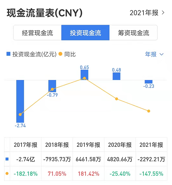 2019年-2021年,正源股份投资现金流分别为6461.58万元、4820.66万元、-2292.21万元,变动幅度分别为181.42%、-25.4%、-147.55%。